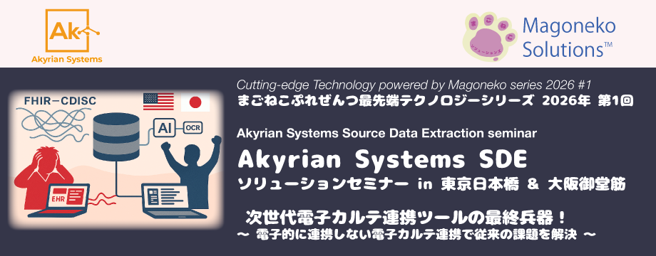 This seminar will introduce the Akyrian Source Data Extraction (SDE) solution, which overturns conventional wisdom regarding electronic health record integration. We will explain an innovative integration method with electronic medical record systems using Reverse FHIR technology, as well as an approach that incorporates the latest global initiatives, including compliance with protocol templates defined in ICH M11.